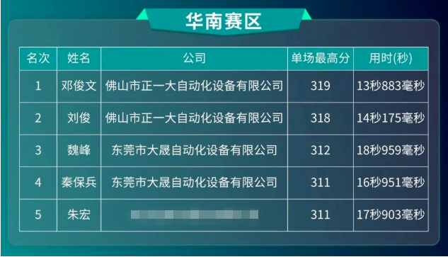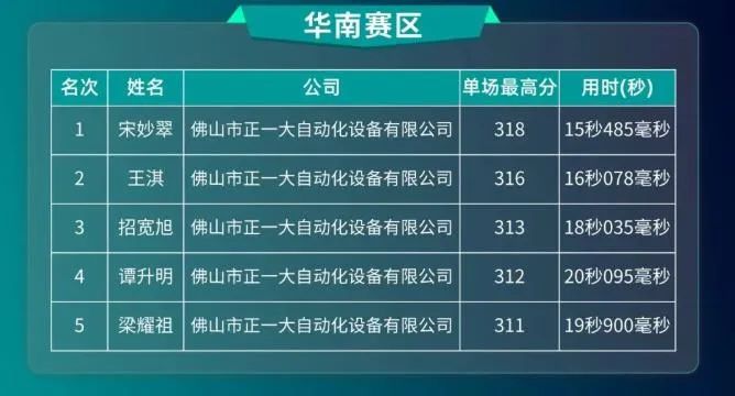 在突圍晉級賽中,華南賽區(qū)銷售賽道上,正一大自動(dòng)化以難以撼動(dòng)的優(yōu)異成績,獨(dú)占僅有的5個(gè)晉級名額,正一大自動(dòng)化的宋妙翠以單場最高分318分,最短用時(shí)15秒485毫秒的好成績占據(jù)榜首。
