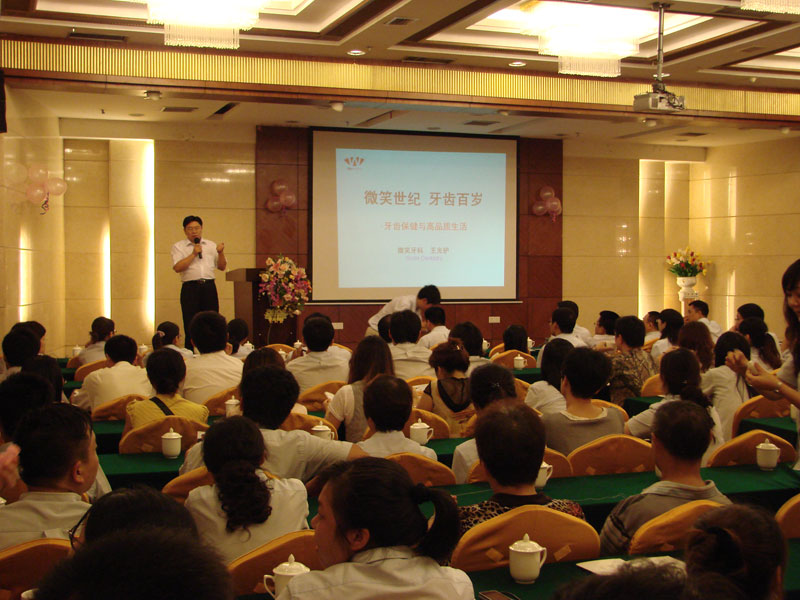 19時30分,講座正式在石灣賓館五樓會議室開始。臺上,主持人詳細介紹了王主任的背景,臺下,座無虛席,大家都專心期待王主任講授。在熱烈的掌聲歡迎下,王主任正式開始了本次講座,王主任分別從牙齒保健三部曲、五步圖等方面講解了牙齒保健的重要性和需要注意的各方面。學術專業、知識廣博、風趣幽默,相信這是臺下多數人對王主任的印象,王主任深入淺出的講解,令我們對牙齒保健有了更深一層的認識,相信以后我們能用科學的方法"照顧"我們的牙齒。在最后的互動提問環節,大家都爭取機會提問和自己有關的牙齒保健問題,王主任都逐一耐心地解答,微笑牙科工作人員還對提問的員工贈送了小禮品。最后,講座在一片感謝的掌聲中圓滿結束了。 (人力資源部)