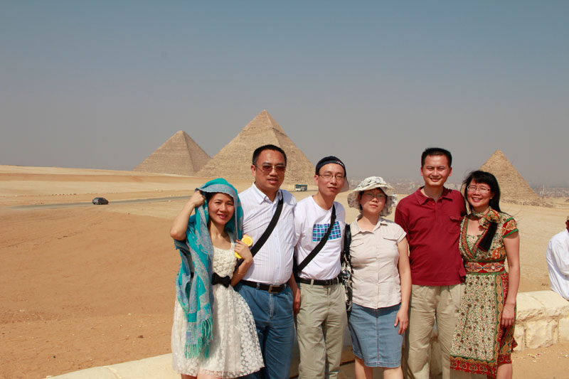 下午來到埃及代名詞金字塔和獅身人面像,自學生時期讀到世界歷史,就產生對金字塔和獅身人面像的敬意,今天終于能一睹它的芳容。來到金字塔前,被眼前的所震撼,除了馬上照相片作紀念外,忍不住跑到金字塔旁,撫摸這2噸多重的巨石,猜想4000多年前古埃及人建造是怎樣堆把230多萬塊石頭一共重684萬噸,削切成精確的斜度疊到146米高,4000多年世界最高建筑,至今唯一留下的世界古代七大奇跡。再看那獅身人面像,它那飽經滄桑的面孔和形體都似乎蘊含著一種難以破解的神秘,它忠實守衛著金字塔墓下的國王們,仿佛是埃及歷史的見證人,目睹埃及由盛轉衰的歷史。看見金字塔和獅身人面像,不由想起古埃及往昔的輝煌。